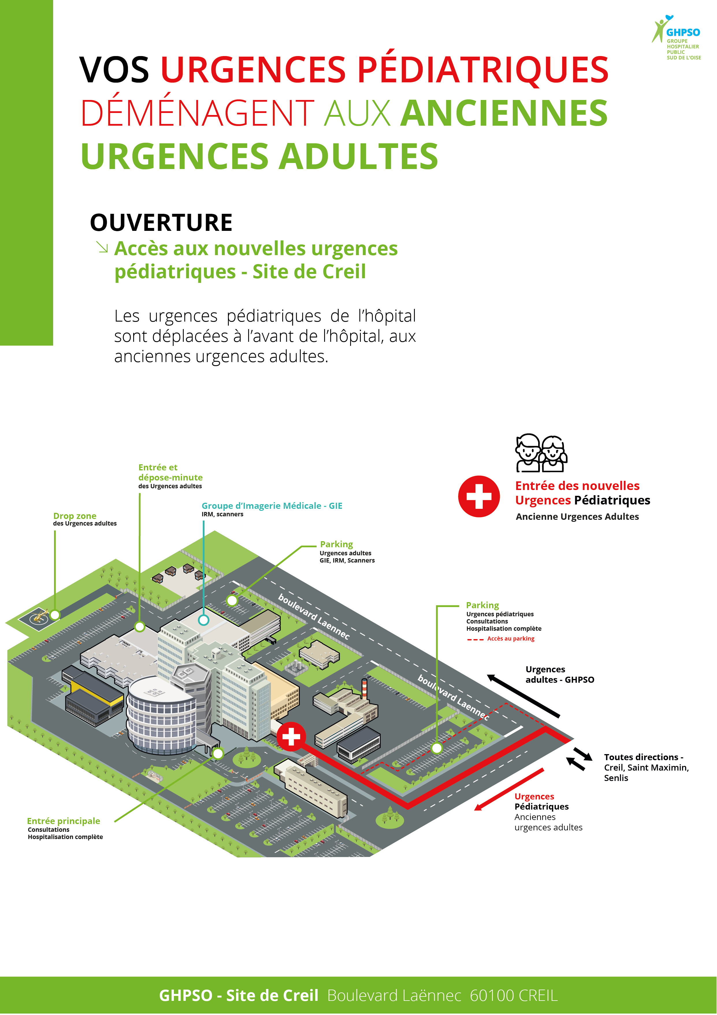 Le Groupe Hospitalier Public du Sud de l’Oise (GHPSO) informe qu’à compter du 20 octobre 2025 à 15h, les urgences pédiatriques du site de Creil seront temporairement relocalisées dans les anciennes urgences adultes, situées à l’avant du site hospitalier.